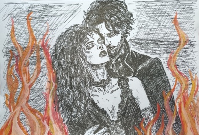 Родольфус и Беллатриса Лестрейндж танцуют вместе на морском побережье в сполохах огня.